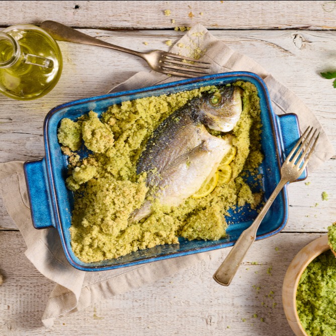Mořský vlk s nakládanou červenou cibulí a bramborovým salátem