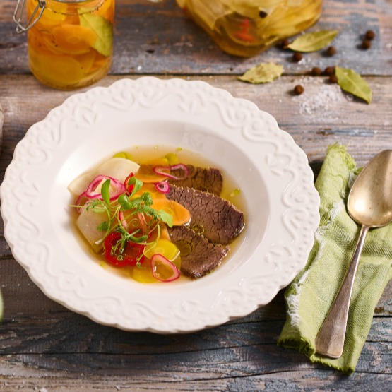 Hovězí vývar s nakládanou zeleninou a olejem